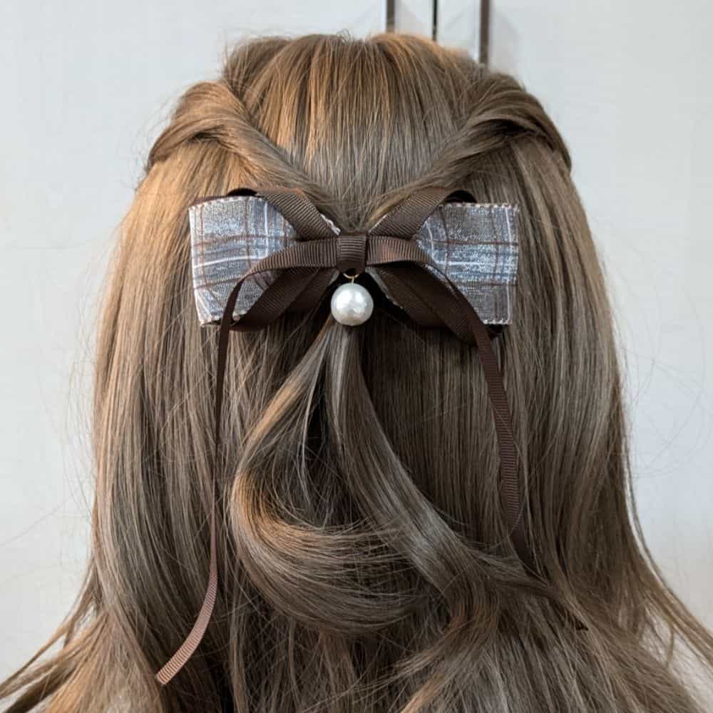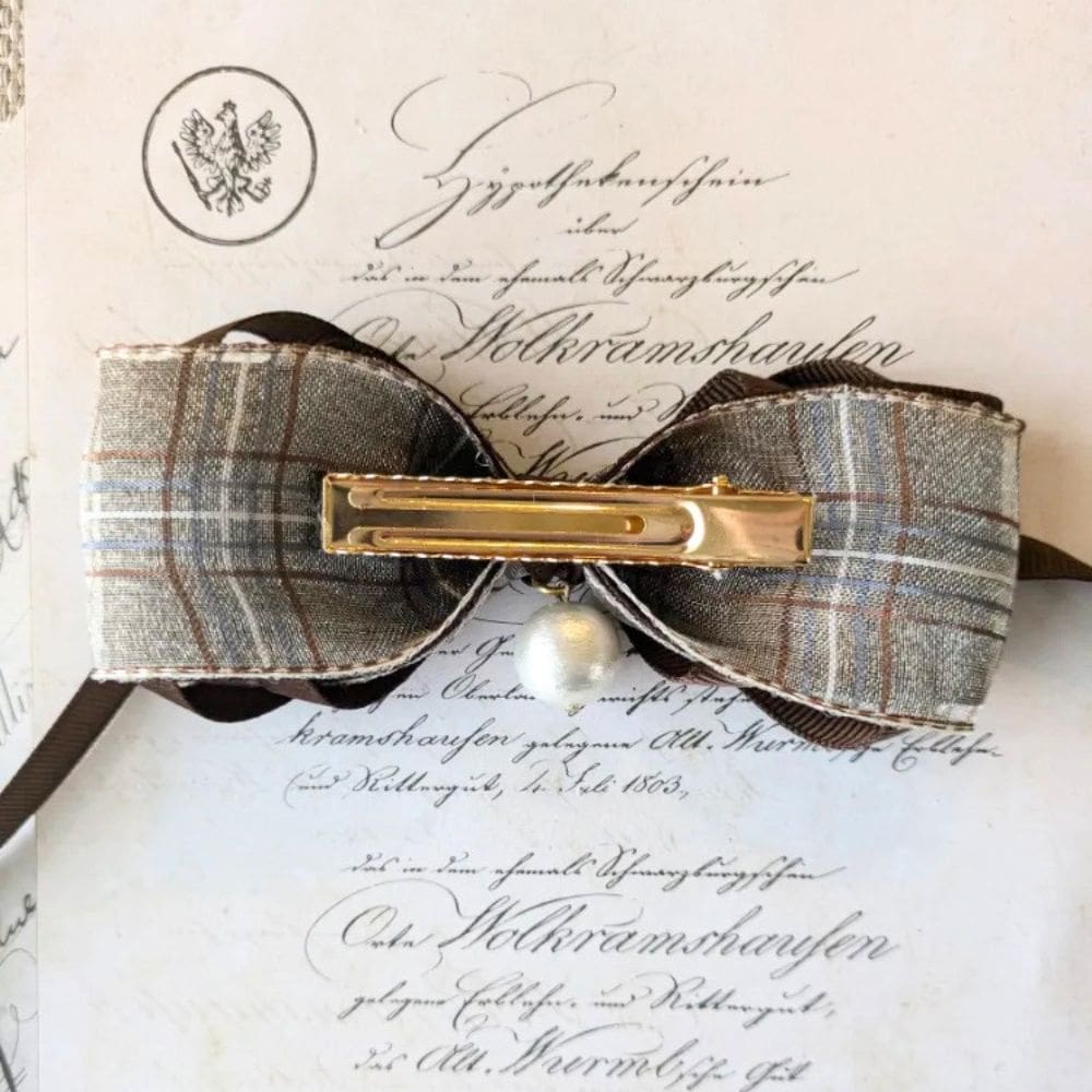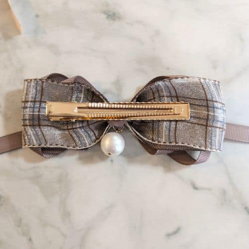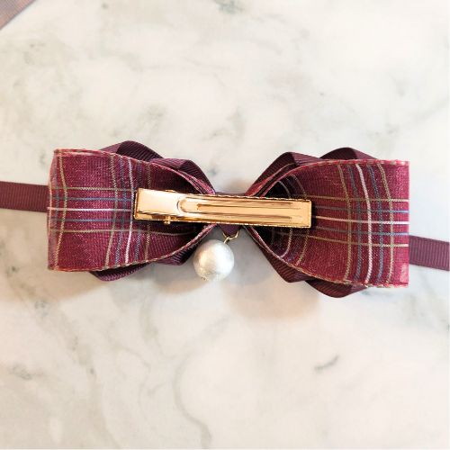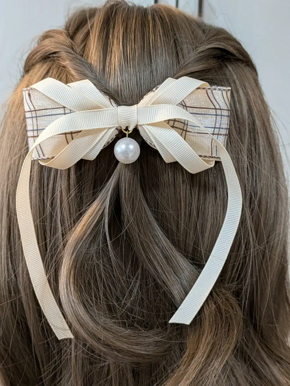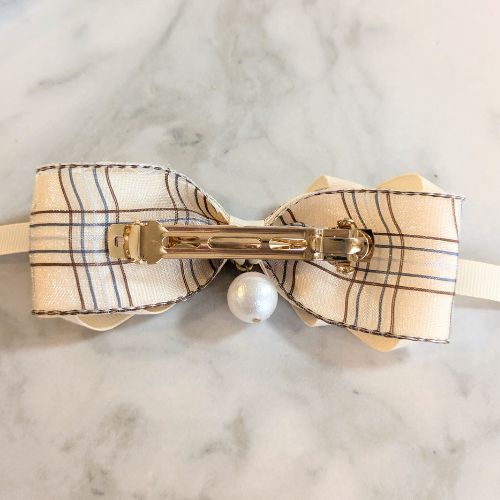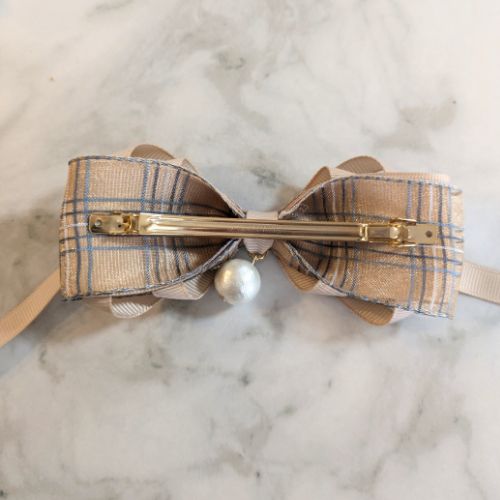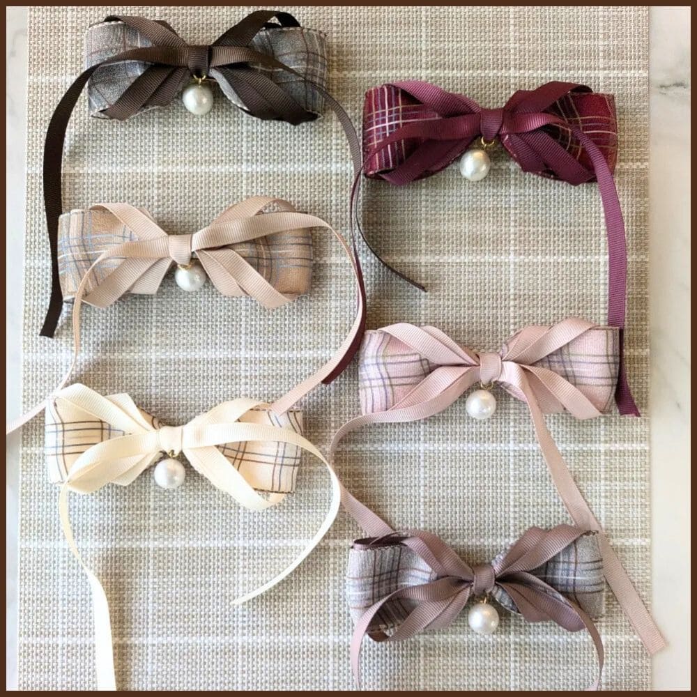 秋色のグログランリボン生地にチェック柄のオーガンジーリボン+コットンパールがゆらゆら揺れるヘアアクセサリーです。秋色満載の6色展開。金具タイプは4タイプからからお選び頂けます。大人可愛いチェック柄であなたらしさを演出してください。