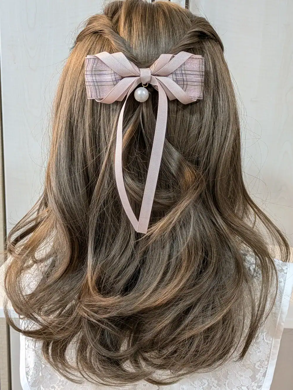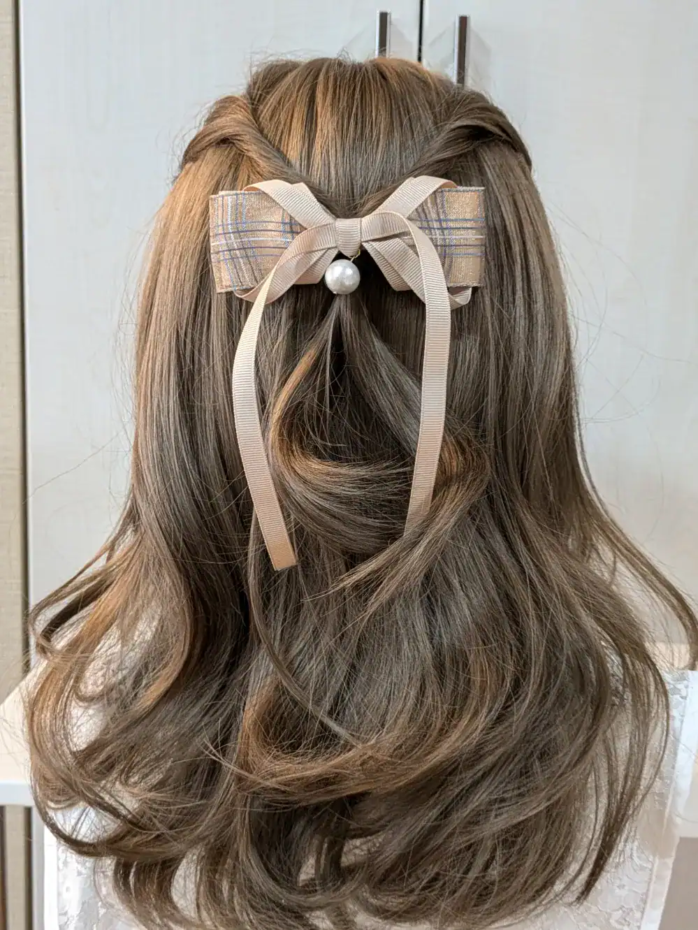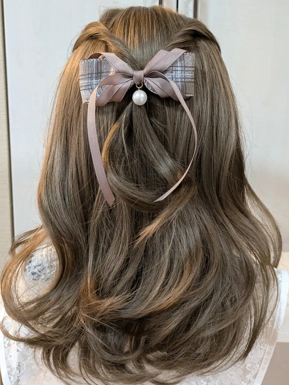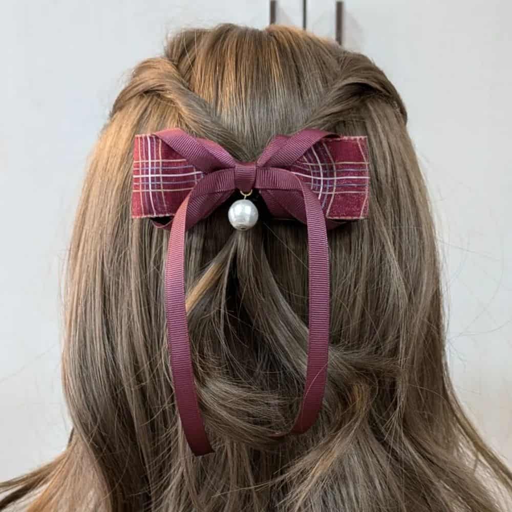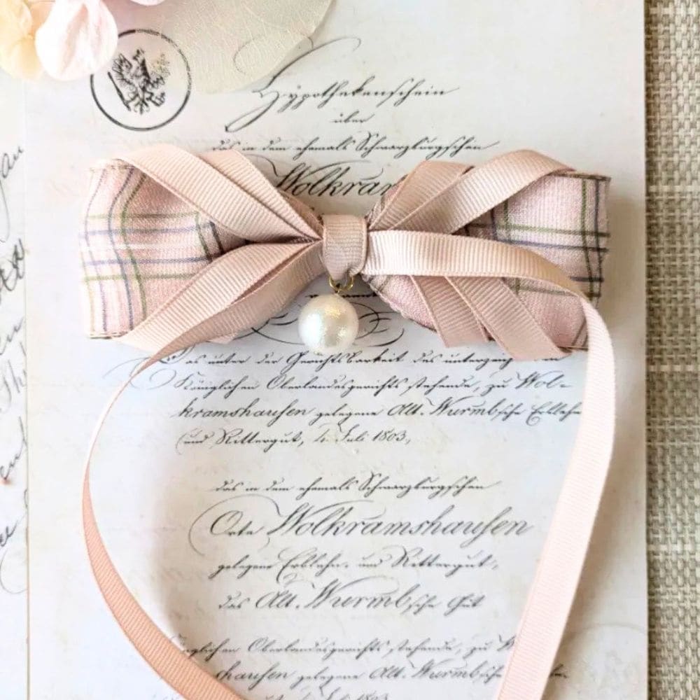 秋色のグログランリボン生地にチェック柄のオーガンジーリボン+コットンパールがゆらゆら揺れるヘアアクセサリーです。秋色満載の6色展開。金具タイプは4タイプからからお選び頂けます。大人可愛いチェック柄であなたらしさを演出してください。