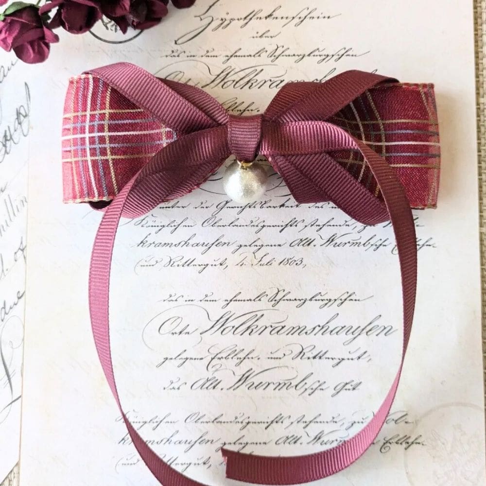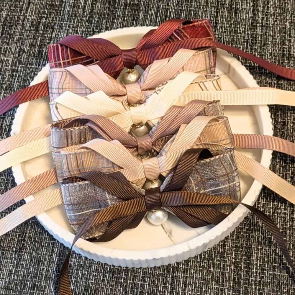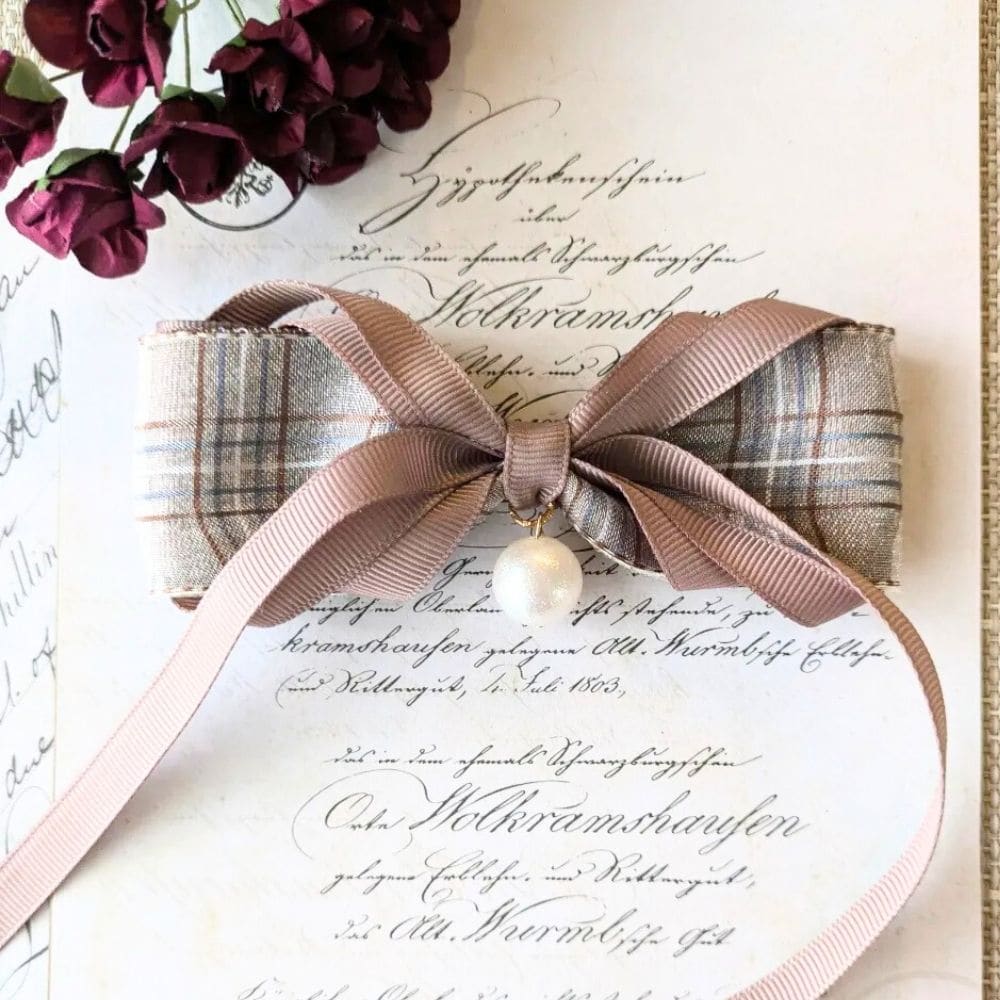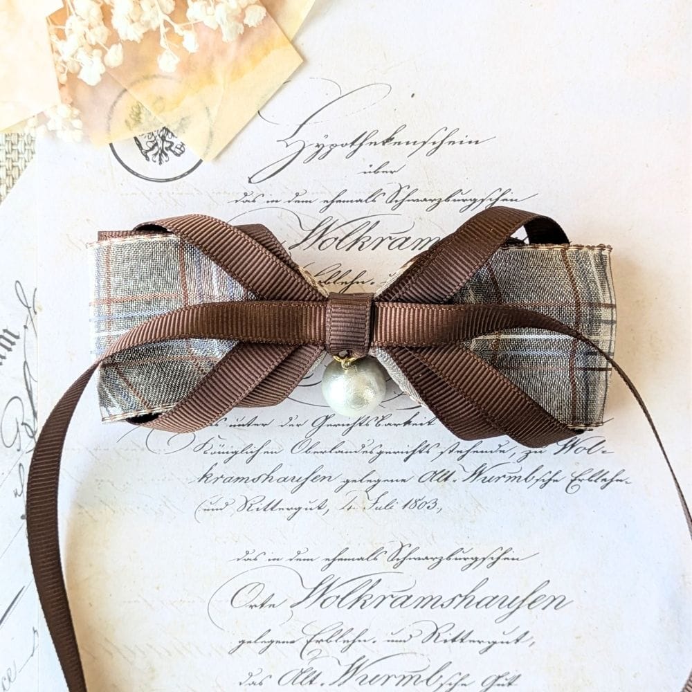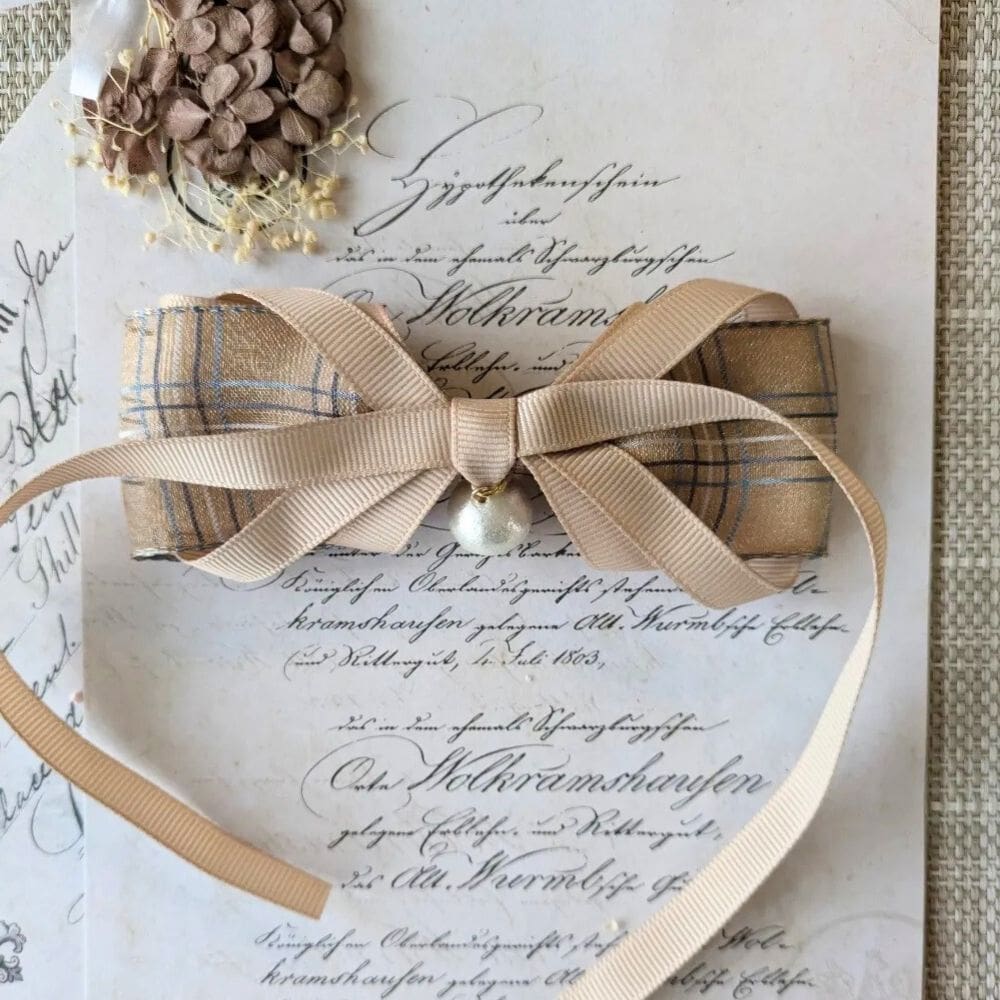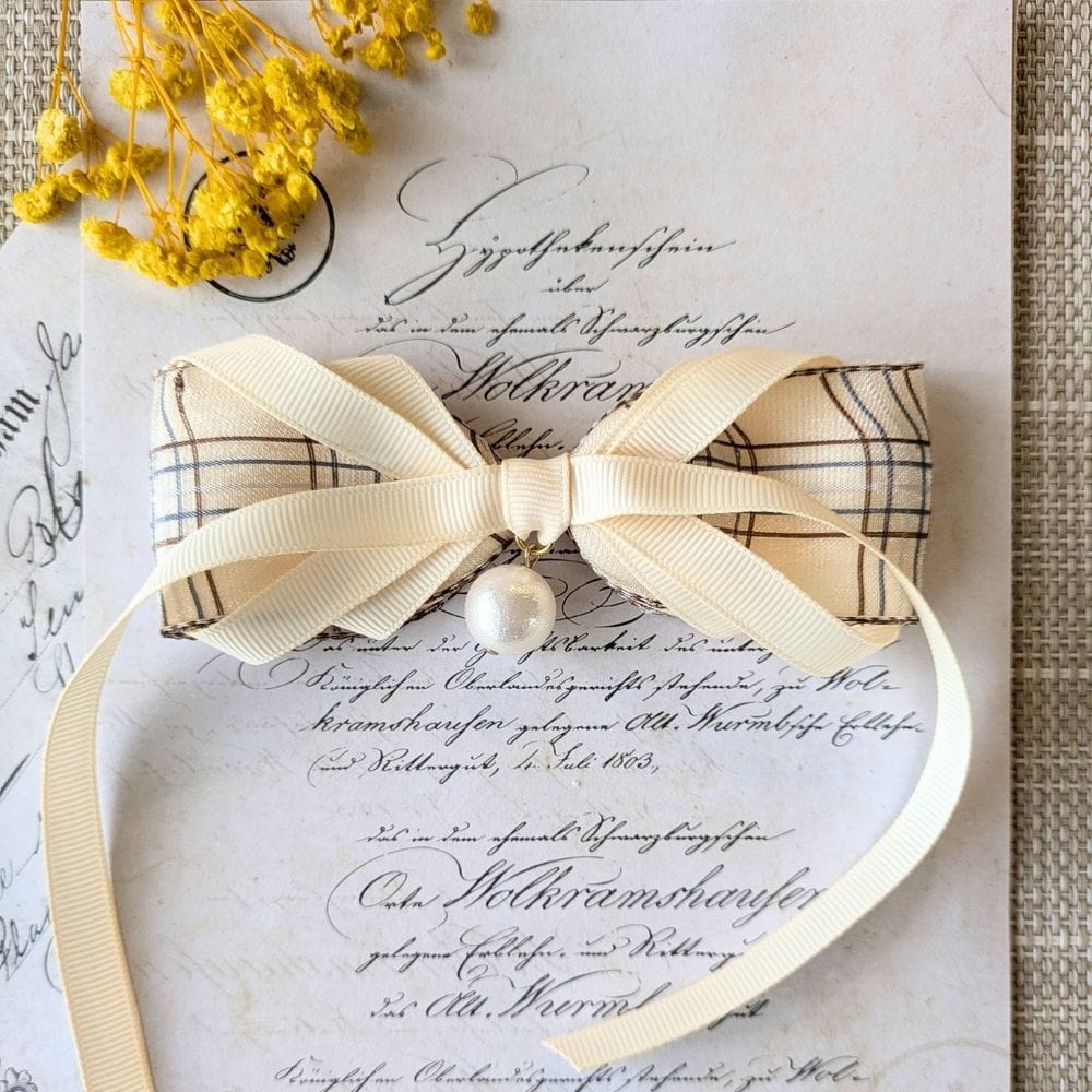 コットトンパールが可愛い♪秋色チェックリボンヘアクセ